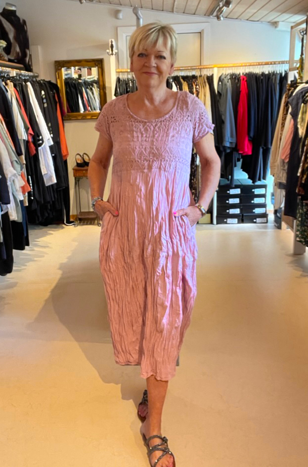 Kjolen har lommer og vises her i 'crashed' udgave. Kan også skylles og tørres i tørretumbler, så kjolen bliver glat.
