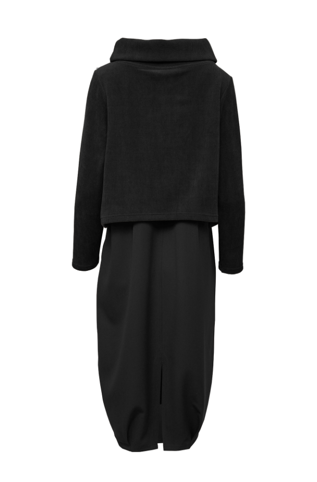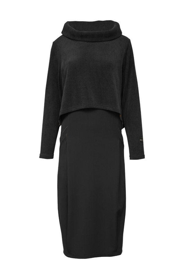 Kjole i 2 slags stof med blød overdel og fast underdel.